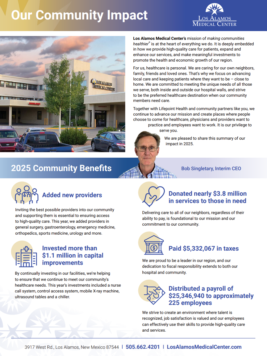 The full 2025 Community Benefit Report is available for public review on the Los Alamos Medical Center website.